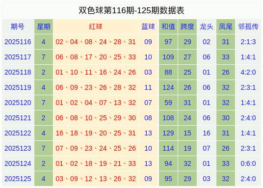和值走势:上期奖号和值为95,近十期和值的平均值为101.70,在近十期中,有5期和值高于平均值,上期和值低于平均值,本期推选和值在54支配。 跨度分析:上期跨度29,与上期比较下落3个点,近5期跨度24、15、19、32、29。本期存眷跨度出刻下18支配。 邻孤传分析:上期未出现传码,邻孤传比例为2:4:0,近十期邻孤传比17:35:8,本期要点存眷孤码有出号上风,推选邻孤传比例2:4:0。 蓝球分析:最近10期蓝球号码永别开出09、10、03、11、07、08、13、10、13、09,大数蓝球出号率较高,上期开出大数蓝球09,本期预测极少蓝球开出,蓝球参考06。 马德文双色球2025126期预测: 红球三胆:07,08,19 15+5大复式参考:01,02,04,05,06,07,08,12,14,15,19,21,23,25,33+06,09,10,13,16 9+3小复式参考:01,05,07,08,14,19,23,25,33+06,09,16 单挑6+1参考:01,05,07,08,14,19+06 [扫码下载app武汉泰睿科技有限公司,中过数字彩1千万以上的各人齐在这儿!]